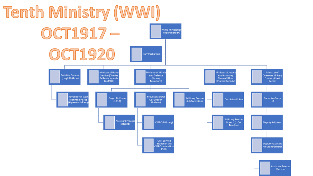 I like to understand the organizational relationships, both horizontally and vertically, of the subject. Besides, I thought this was a task that I had nearly completed. Little did I realize how convoluted and entangled the relationships were between the Police units (C.M.P.C., Dominion, R.N.W.M.P) and the ministries. Furthermore, some positions, like the Minister of Aviation, I haven’t been able to verify. With that, here is a look at the relationships between the Ministries and Policing elements of Canada and the Military Services Act, 1917.